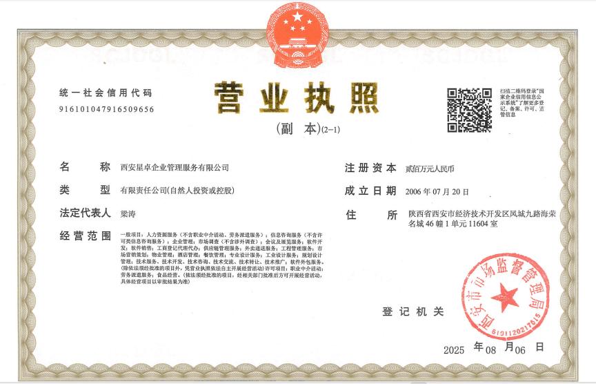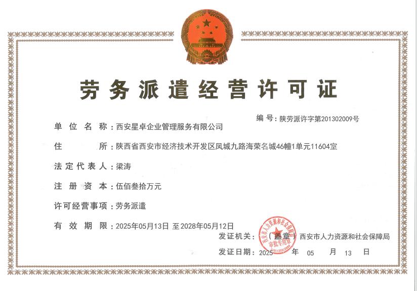 西安星卓企業(yè)管理服務(wù)有限公司勞務(wù)派遣經(jīng)營許可證