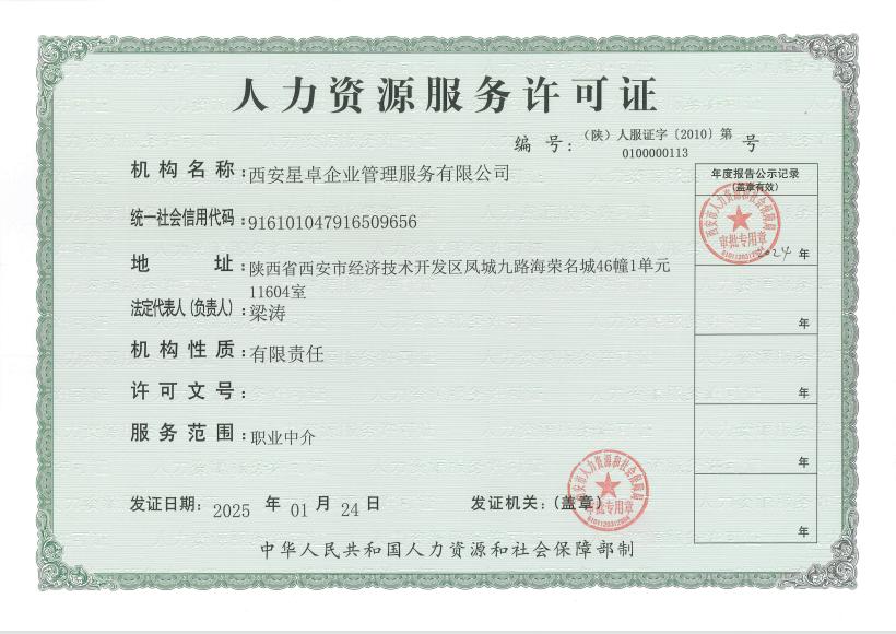 西安星卓企業(yè)管理服務(wù)有限公司人力資源服務(wù)許可證